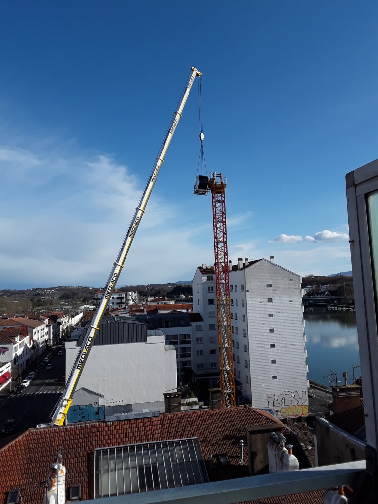 L’eau n’a pas été longue à envahir ce trou. Il y a eu des pompages réguliers Il semble même que le chantier a été interrompu quelque temps. Mais cela n’a pas empêché l’installation des piliers pour le montage de la grue, qui a commencé le 8 mars 2022 (voir photo montage). Elle s’est effondrée dès le 9 mars.