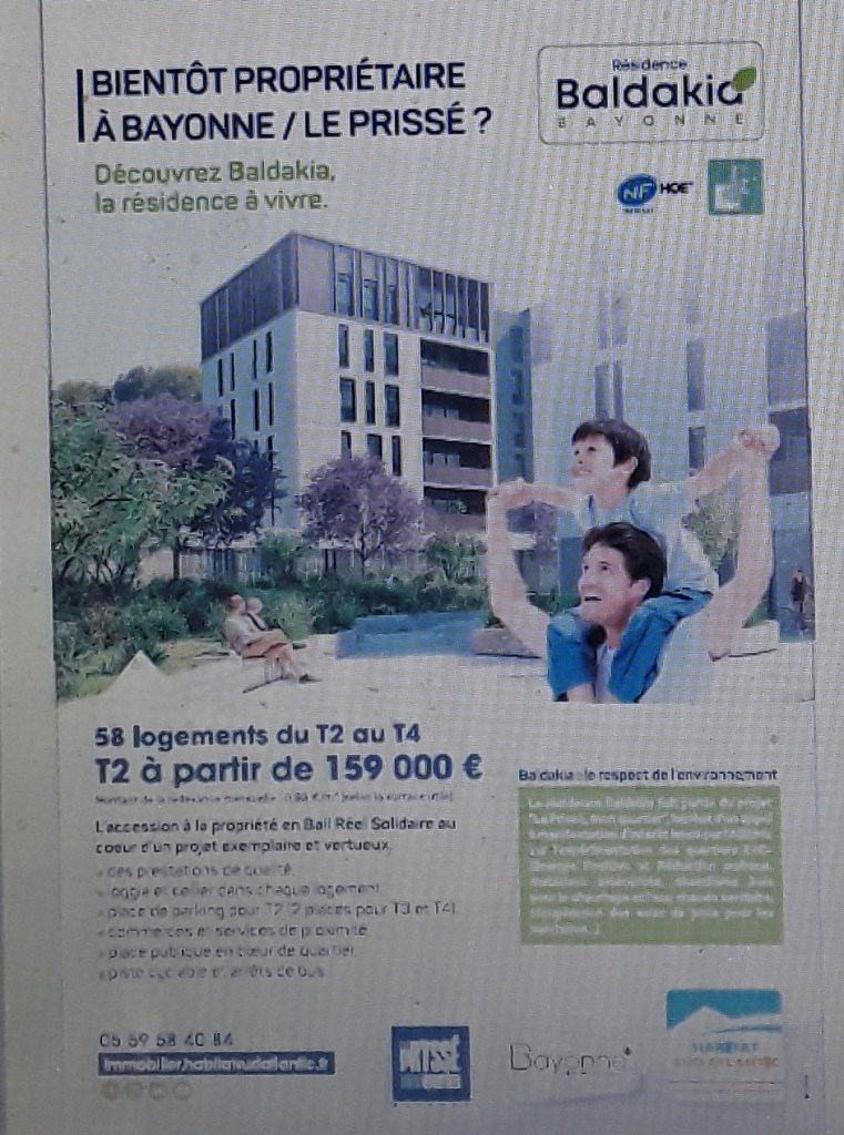 Les 3 autres blocs, soit 192 appartements, vont être confiés à … Alday, promoteur et spéculateur immobilier phare de Bayonne. Selon Sud Ouest, une partie, 53, seront à prix « maîtrisés » (4 000 euros le m², pas donné quand même) ; les futurs acheteurs, à ce titre, s’engagent à faire de leur appartement leur résidence principale, et à ne pas le revendre avant 10 ans. Pour les autres, 139 logements, ce sera 4 500 euros le m². A ces prix, s’ajoutent les garages.