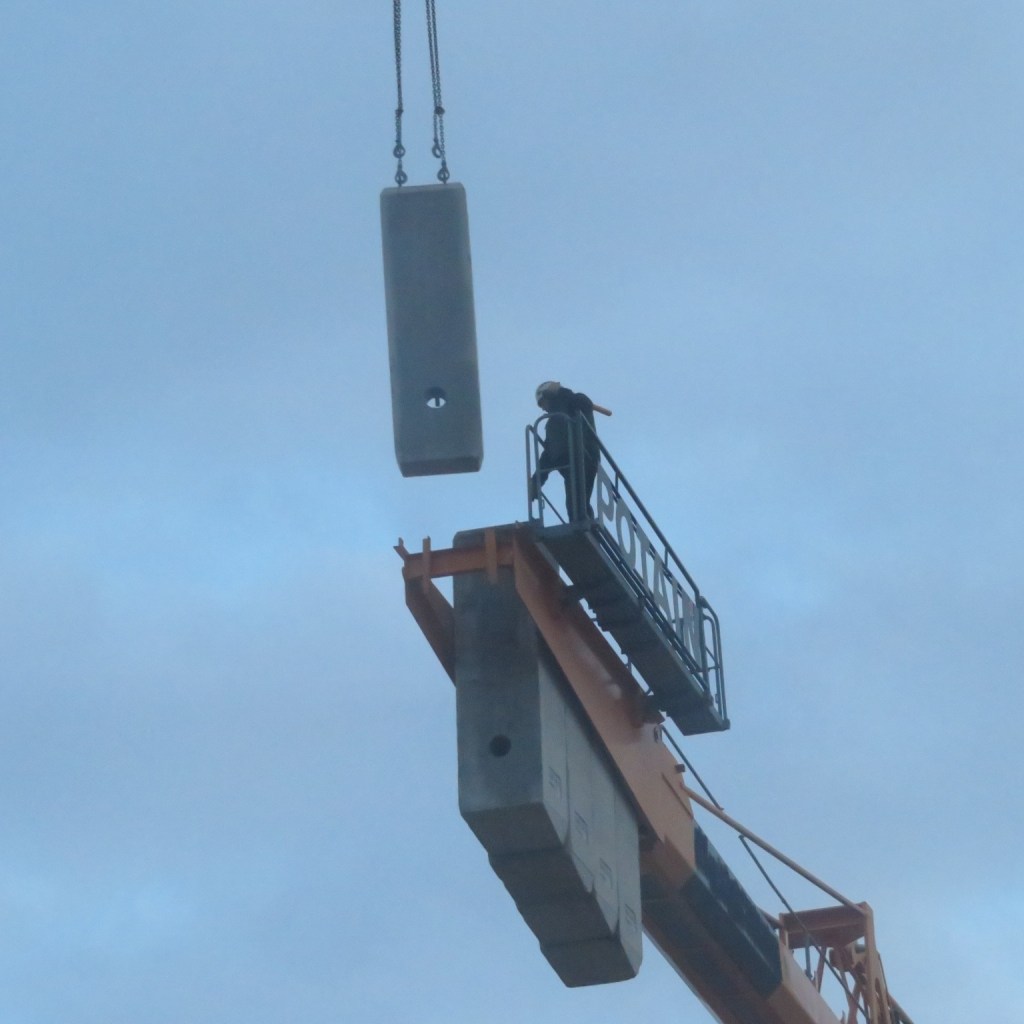A l’automne dernier, sur le terrain dévasté, inondé, les systèmes de pompage, les tractopelles, les engins de terrassement et de forage sont entrés en action ; le 8 janvier 2024 une nouvelle grue a été montée ; aujourd’hui des ouvriers exécutent les travaux, coulent des dalles, érigent des murs, en béton.