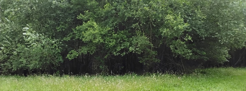 Un champ attend d’être coupé. On voit une partie très boisée en direction du ruisseau, et plus simplement végétalisée en direction de l’Ehpad.