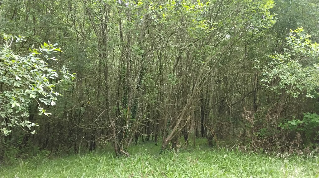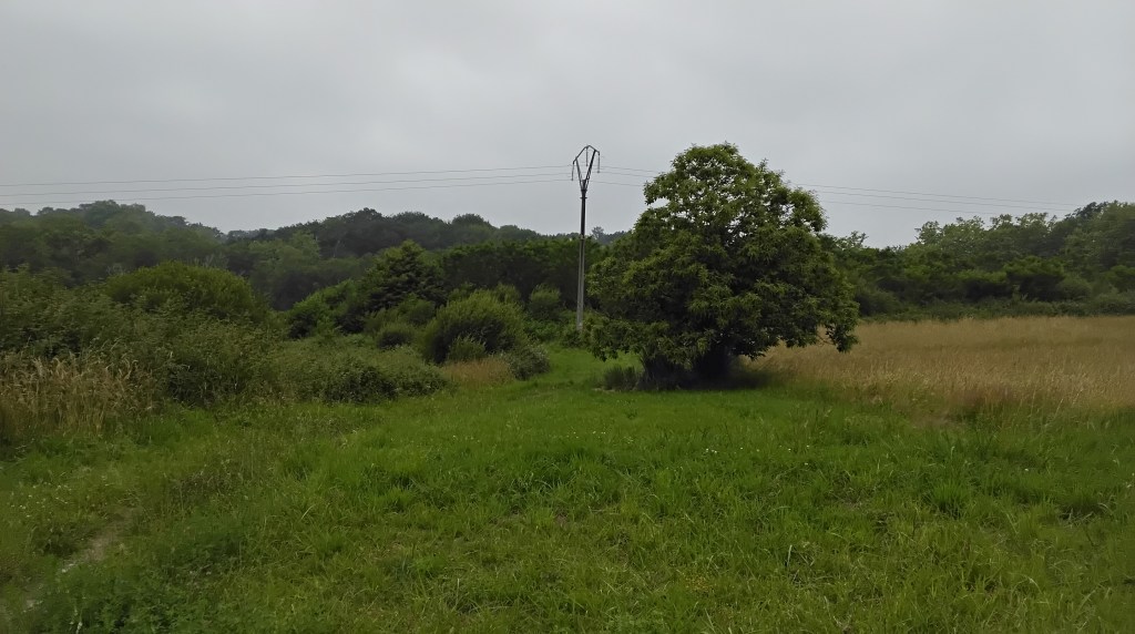 C’est peu praticable, on rebrousse chemin, on longe au nord la rue de Loustaounaou, on repart vers le sud et le centre de la parcelle, où l’on aperçoit les vestiges d’une cabane en lisière de la forêt derrière laquelle coule le ruisseau des Anges. On oblique vers le nord-ouest et on passe à côté d’un arbre remarquable (?). On arrive en lisière nord ouest du périmètre Sequé 4 où passe une ligne HT