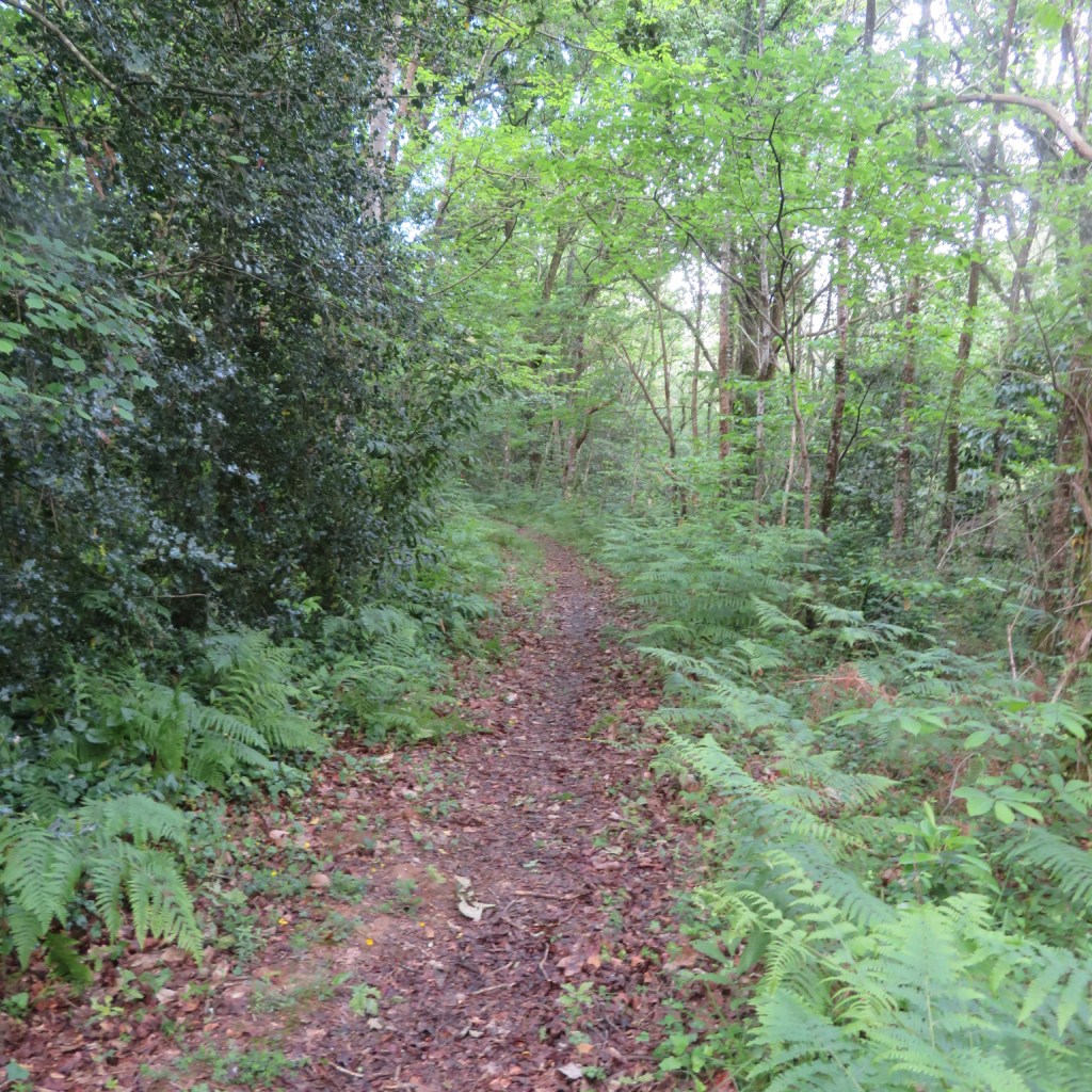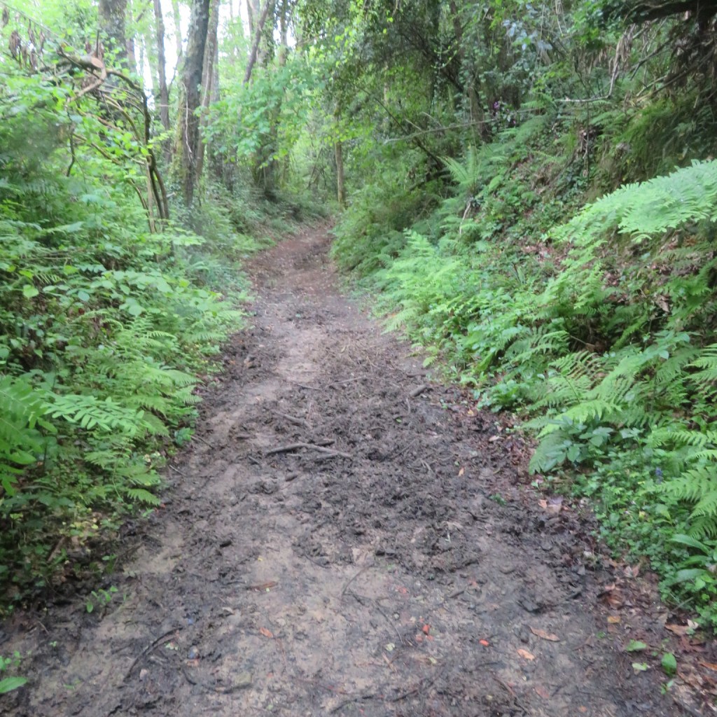 On descend par un sentier qui porte les traces du « labourage » par des sangliers.