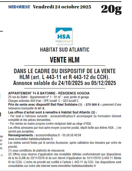 Ils se sont donc mis à ces ventes, mais « avec modération ». On voit régulièrement des annonces dans la presse « HLM à vendre ». Dans le supplément immobilier de Sud Ouest du 16 octobre, le bailleur Office 64 indique qu’il vend entre 5 et 10 HLM chaque année, vente réservée à ses locataires qui ont au moins 2 ans d’ancienneté. La vente se fait en BRS « pour que le bien reste dans le contingent des quotas SRU de logements sociaux ». Dont acte : il s’agit d’un transfert d’un logement locatif public à un logement semi-privé, sans d’ailleurs que l’argument de la sauvegarde du foncier public ne soit évoqué,pour le justifier. Cela diminue le parc locatif : on peut se demander si ces ventes sont toujours compensées par un nombre équivalent de constructions supplémentaires.