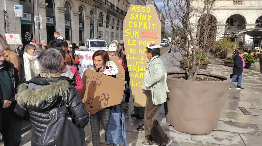 Deux manifestations ont eu lieu à Bayonne. Avec 250 personnes le 25 février. Le 28 février, il s’agissait de porter le deuil de nos pertes associatives. Aux côtés des centres sociaux, on pouvait rencontrer les cyclistes de Txirrind’Ola et la Clavette, le Planning familial, Etorkinekin, Saint Esprit sur le Pont (association de quartier), etc.