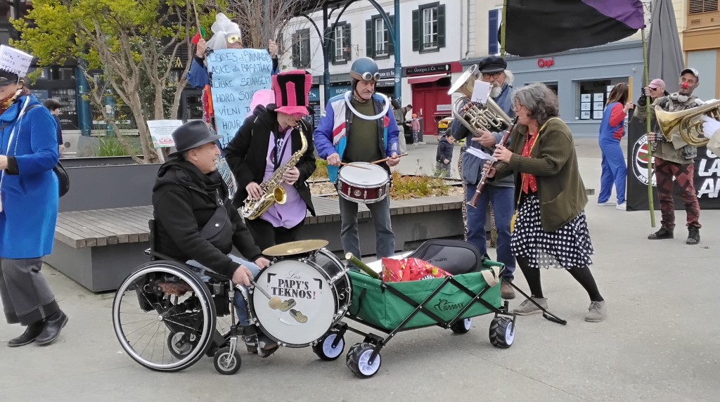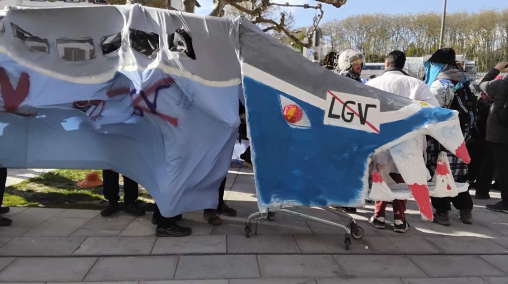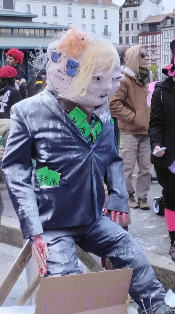 La LGV, c’est nonOn se regroupe place de la RépubliqueOn part en défilé derrière une batucadaDanse au confluent de la Nive et de l’AdourFoule place du RéduitVive la communeLibres et sauvages en plusieurs languesSainte Soline, c’est aussi notre présentLes Papy’s Teknos au carré des HallesOn danse sur le carré des HallesDans le défiléTrump enfarinéOnn’oublie pas la crise du logement et les résidences secondairesLe maître spéculateur, ami du maire, sera achevé à coups de bâton
