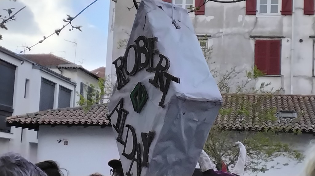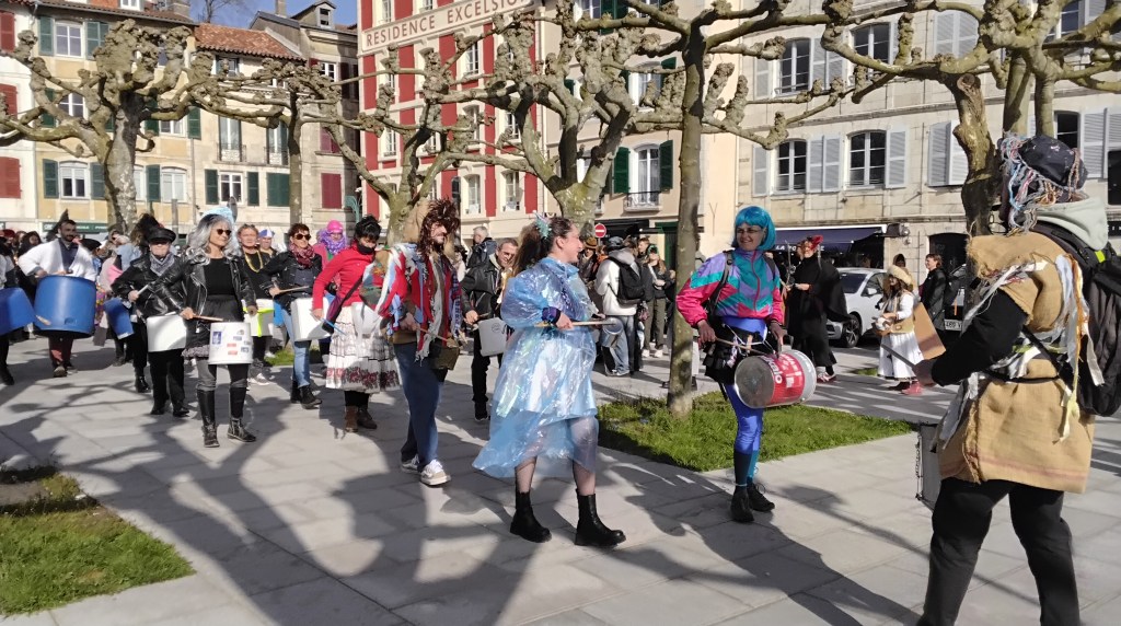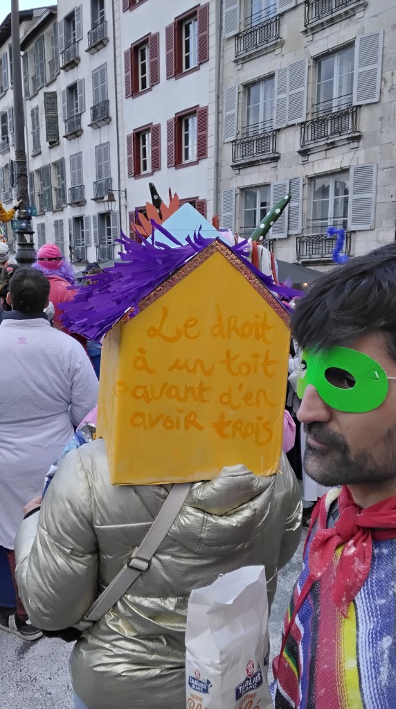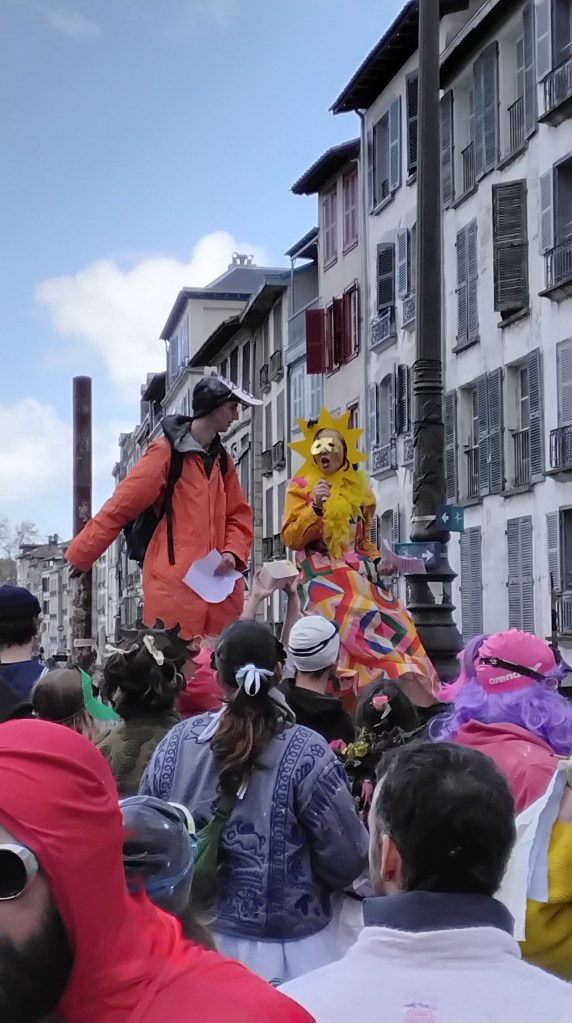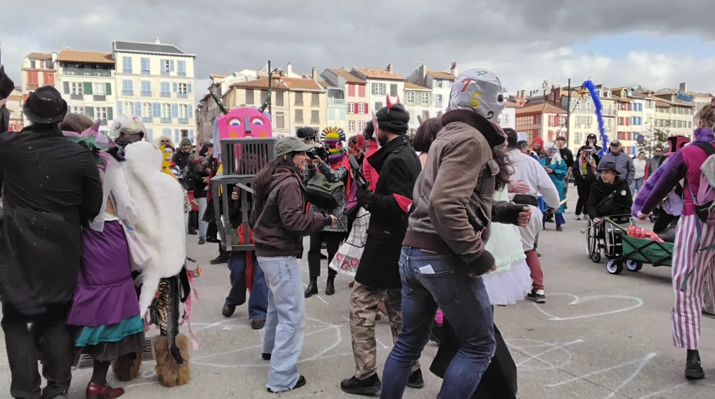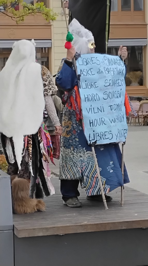 Ce samedi 28 octobre, les rues de Bayonne ont été animées par un carnaval libre et sauvage, renouant avec les traditions d’un carnaval fantaisiste, politiquement incorrect, loin d’un spectacle pour touriste. Un poteo joyeux pour se faire plaisir, se déguiser, danser, chanter. Pour porter toutes les colères et revendications. Pour fêter le printemps. Pour faire une fête d’adieu à Zanpantzar, fauteur de tous nos maux.